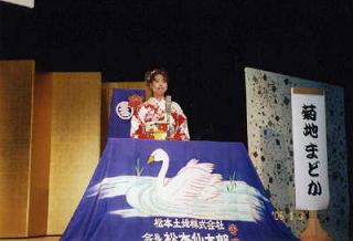 菊地まどかさん(30歳)は、平成8年から河内音頭の櫓を舞台に歌い始め、13年には成世昌平師の甲会に入門し名取になり、富山テレビ番組「サンザワールド民謡大会」では優勝、翌年には和歌山県知事賞を受賞。